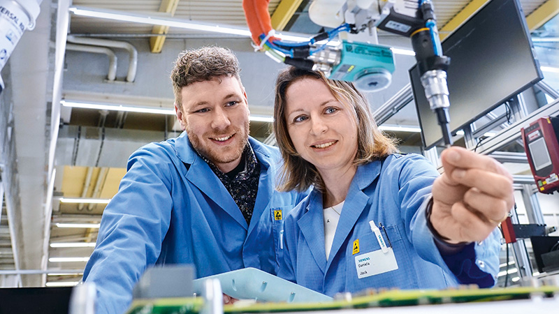 Sichere und reibungslose Zusammenarbeit von Mensch und Roboter ist kein Szenario aus der Zukunft, sondern Alltag im Siemens-Gerätewerk Erlangen. In der hochmodernen Fabrik erledigen Cobots unter anderem Aufgaben, die für Menschen auf Dauer zu anstrengend wären.