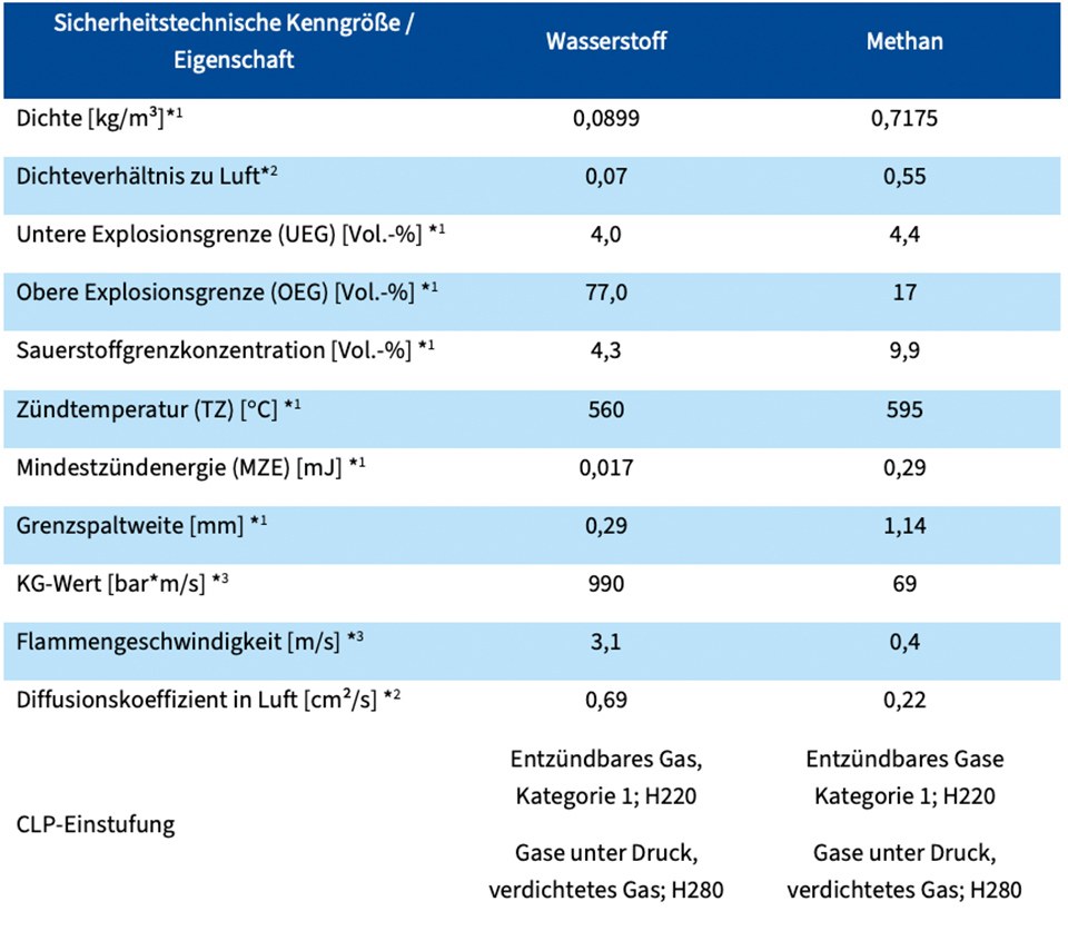 Im Vergleich zum Erdgas, das größtenteils aus Methan besteht, hat Wasserstoff ein höheres Gefährdungspotenzial, insbesondere hinsichtlich Brand- und Explosionsgefahren. Das zeigen die sicherheitstechnischen Kenngrößen und Eigenschaften von Wasserstoff und Methan deutlich (siehe Tabelle).
