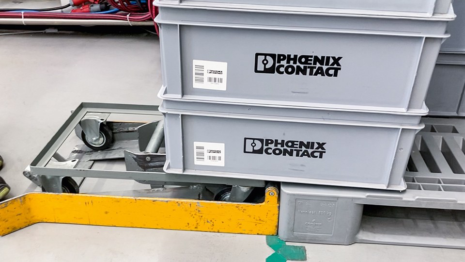 Wie in vielen Elektronikunternehmen kommen auch bei Phoenix Contact Euronormwannen zum Einsatz, um darin Bauteile zu sammeln. Beschäftigte stapeln die Wannen, transportieren sie auf Rollwagen und schichten sie schließlich manuell auf Europaletten um – eine körperlich belastende Tätigkeit für die Beschäftigten. „Dann kam uns der Zufall zur Hilfe“, berichtet Elisabeth Strathaus, Leitende Sicherheitsingenieurin bei Phoenix Contact. In einer Lagerhalle entdeckten Beschäftigte den Prototyp einer Schiebehilfe, der offenbar bereits für ein ähnliches Problem an anderer Stelle entwickelt worden war. „Das war der Ausgangspunkt für unsere heutige Lösung“, sagt Strathaus.